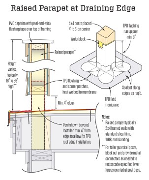But we have also found TPO post sleeve flashing to be pretty reliable, so we’re comfortable putting posts through the membrane when necessary. We definitely cover the entire post with a good WRB all the way to the top to prevent the classic “water leaked through a crack in the post” that can still happen with the best roofing job (for a post connection detail that will work with a raised parapet, see “Raised Parapet at Draining Edge Detail” in “Low-Slope Roofing Details That Work” ).