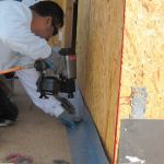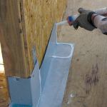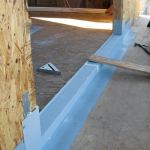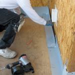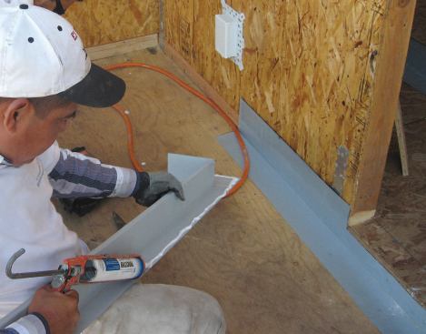 Door pans. Our first step is to install an L-shaped wall flashing below door openings and lap a sill pan over top. The horizontal leg of the wall flashing is 4 inches wide, and the 6-inch vertical leg is notched at the door opening so it finishes flush with the interior subfloor.