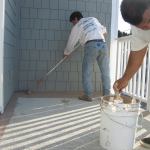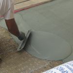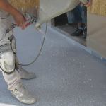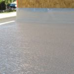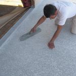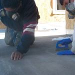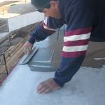 The protective layer can be covered with tile, stamped concrete, or some kind of textured finish. On this project we used Desert Brand’s Texture and Liquid Polymer to create a low knockdown finish. The texturing material is mixed with polymer to the consistency of thick pancake batter and then splattered onto the surface with a pneumatic hopper gun. When the sprayed material begins to set, the applicator runs a trowel across its surface, thereby creating a knockdown texture.