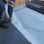 The middle layer of the three-coat system provides the actual waterproofing. It consists of a layer of 3/4-ounce chopped mat fiberglass — which is a loose nonwoven fabric — saturated with acrylic resin. The material comes in 4-foot-wide rolls and can be cut with scissors or a utility knife. As with fiberglass batts, it’s a good idea to wear long sleeves, gloves, and a dust mask. We lay the fiberglass on the deck and use a paintbrush and standard 3/8-inch paint roller to coat it with Bonder 480 resin. We ordinarily start at the drip edge and work back toward the door.