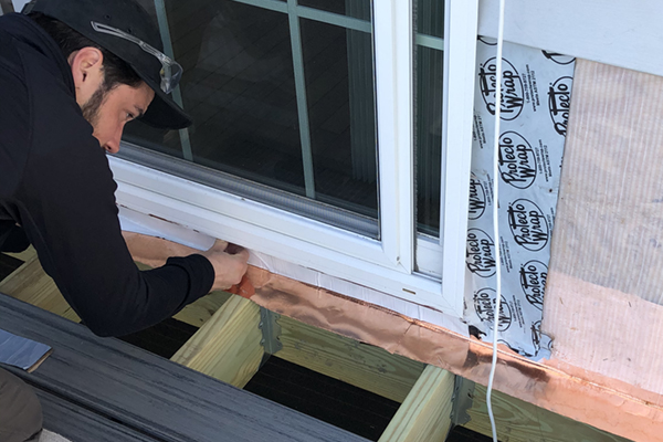 L-shaped copper flashing is installed on top of the ledger along the deck-to wall juncture. The new deck was raised 4 inches to decrease the step down from the sliding door.