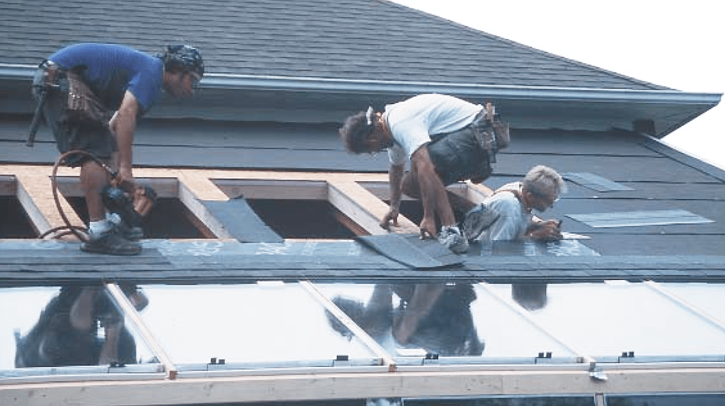 We start at the bottom, attaching the membrane to the skylight and smoothing it onto the roof. The sides are next, with the areas between adjacent skylights the biggest challenge. With all hands on deck, we take positions at top, bottom, and middle and try to keep the membrane from sticking to itself and making a mess. The piece is cut so that it extends about 6 inches beyond the skylight, top and bottom. We adhere the membrane to one skylight and smooth it down toward the roof and back up onto the other skylight .