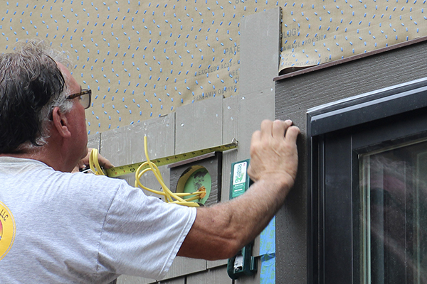 A critical part of a good-looking installation is lining up the shingle coursing from one façade to the next, even when corner boards are installed. We snapped installation level lines, which we transferred over the Boral trimmed-out inside and outside corners, to maintain the alignment. You can tweak the shingle exposure somewhat—1/8 inch here, 1/8 inch there—or make up a 1/2‑inch difference in height over three or four courses between windows, but it’s important to maintain your installation level line around the home in order to line up with the starting façade’s coursing at the end (in this case, on the garage wall).