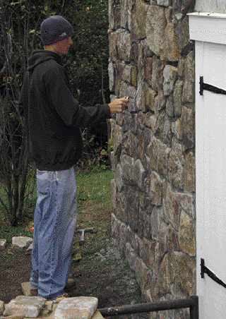 We installed the stone working horizontally from the bottom up, so that each successive course would be supported by those below. We jointed the stones as we went along, using a tuck pointer, then brushed the face clean of excess mortar. Tuck pointing after every few courses helped prevent the stone from slipping before the mortar set up (Figure 4).