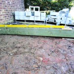 For comfort and layout simplicity, they set the tread depth at 12 inches. For nine 12-inch treads plus a 12-inch column on each side, the forms extended 120 inches from the porch wall to the concrete walkway, which was cut square to the slab.