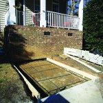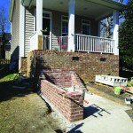 Masonry layout typically starts at the top. For example, when laying out brick veneer on a house, the mason establishes a top line about 4 3/4 inches below the sills of the first-story windows (the thickness of a brick sill sloped to shed water). The mason then measures down from that line to lay out the veneer. For this stair project, the layout started at the porch floor elevation. That height determined the height of the slab base as well as the elevation of each step.