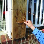 Next, he transferred the 15-inch mark to a brick set on the wall with a 3/8-inch plywood spacer to simulate a mortar joint.