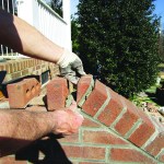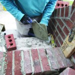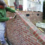 He buttered one side of the last brick with mortar and set it in place, leaving the other joint open. After spreading mortar on a hawk, he used a 3/8-inch tuck pointer to pack the final joint with mortar.