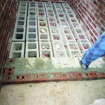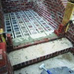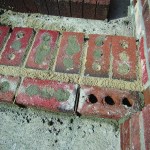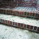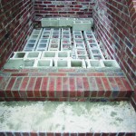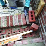 After finishing the rowlock course at the front of each step, he laid two courses of rowlock stretchers behind the front row (33). These bricks ran perpendicular to the front row, with the joints between bricks in each of the two rows offset by half of a brick length. Behind the steps, he filled in with blocks cut to 6 1/4 inches high. With the mortar joint, the blocks came up even with the brick step at the front.