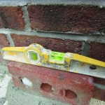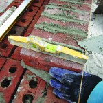 As the author laid each rowlock brick to the line, he set his torpedo level on top to ensure that it was pitched the same as the end bricks.