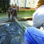 The sidewalk height was close to being right for the slab. The crew used a straight 2-by to screed the concrete even with the sloping forms.