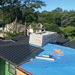 On this job, two large chimneys came up through the metal roof, so we made sure to get the masons in early and out of the way before the metal panels started to go in. For this to happen, we had some “curbs” built to support the stone, which in turn did need that preflash metal installed first. This would have been a huge mess if we had forgotten to have the roofers out before the masons. I’ve found that the best way to avoid missing details is to keep all your trades informed about what is happening and confirm that the planned order of process makes sense to them.