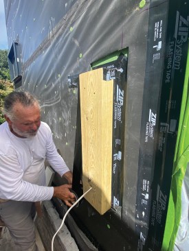 While it’s often possible to hold off on the roofing installation, we also had to make sure that we had installed preflashing (such as at roof-wall intersections where one leg of the flashing had to be installed under the siding). If the roofing contractor is already on site working in other areas, the roofers will most likely be tracking this and can pop over to install the preflashing. Sometimes, however, we needed to request the roofers to come out for the preflashing install.