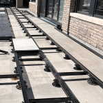 Similarly, we used CMU block set at the elevation of the finished tile as a temporary fill beneath the stonework surrounding the deck. This allowed the tile pavers to slide in beneath the stonework later in the project.
