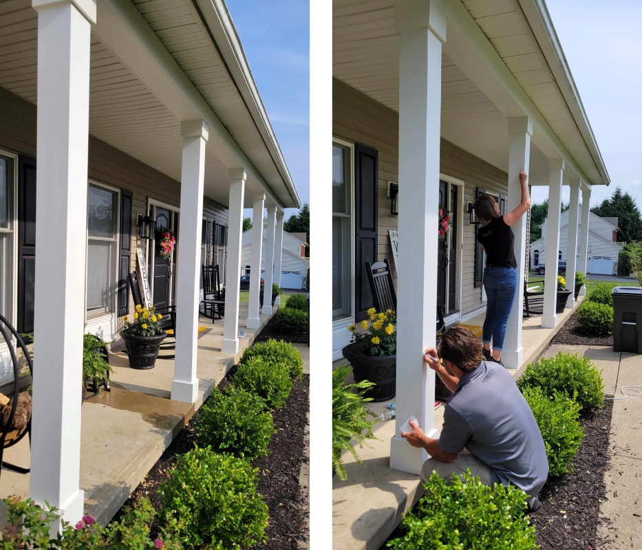 She replaced 300 linear feet of rotting wood trim along the gable peaks and multiple layers of frieze board with AZEK Trim and changed out the house’s original wood columns with six-by-six wood posts surrounded with AZEK Column Wrap. It’s a remarkable transformation.
