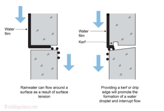 Surface tension causes water to defy gravity and flow around and underneath surfaces. Of concern to builders, this means that rainwater running down the side of a building will flow underneath architectural features that interrupt its path, eventually finding its way into the cladding or building’s interior unless there is a conscious effort to block its path.