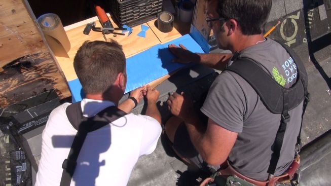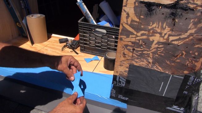 Holding the two pieces in position, Pollard temporarily stuck them together with a piece of tape across the face. Then he flipped the pair over and taped the seam on the back. In service, the hidden tape joint serves the same function as solder in a soldered copper flashing. Removing the temporary tape from the front, Pollard slid the flashing under the shingles against the dormer cheek and face, blind-nailing it to the roof (where roofing shingles would cover the nails) and to the dormer cheek (where housewrap and siding would cover the nails).