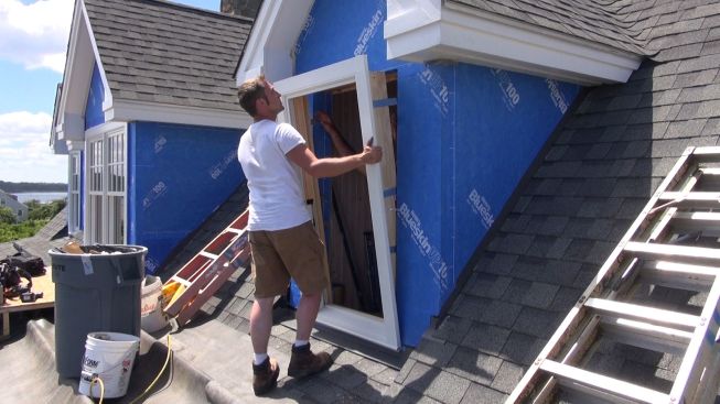 Next, Pollard (helped by carpenter Tyler Strout) attached wood shingles to create a shallow pitch on the sill, in order to direct water down and out in case the window itself leaks in a driving rainstorm. Then he applied a strip of Henry WB25 window and door flashing membrane (a polyolefin film laminated to rubberized asphalt). As with the Ice and Water Shield below the flashing, Pollard used small pieces of the membrane to patch small seams or holes at the corners.