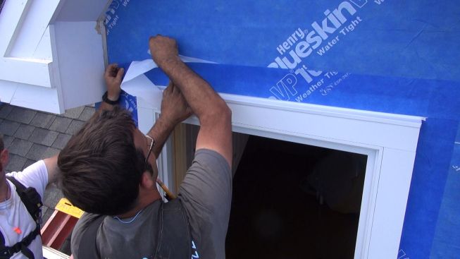 Pollard and Strout wrapped the Blueskin VP100 into the window opening, then set the pre-cased window in place (first laying a bead of silicone adhesive behind the side and top casings). Above the window, they applied a typical cap flashing, then taped the flashing to the wall with a 4-inch strip of VP100. Following Henry’s printed instructions, they applied a bead of silicone sealant to the seam where the window-top strip lapped onto the Blueskin on the wall.