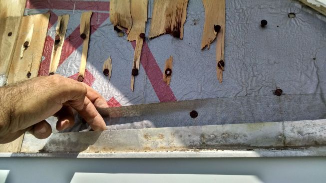 As the photos here show, the carpenters who originally built the house had made a few classic water-management mistakes. At the window head, the Typar housewrap was reverse-lapped, so that any moisture penetrating the wood-shingle siding could find its way behind lower layers of housewrap and onto the top of the window—and indeed, the window showed tell-tale water stains and mildew damage.