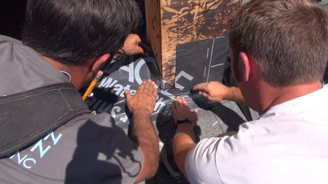 Henry WB25 requires a proprietary primer, Blueskin Spray Prep, that comes in a rattle can. It’s applied like rubber cement: You spray the surface (in this case, the wood shingles), then let the primer tack up and dry before you peel the backing off the membrane and stick it down. WB25 has a split backing tape to make it easier to position and apply, especially in corners.