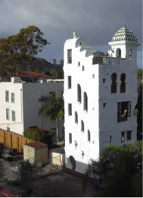 Custom-made tile covers most of the interior and parts of the exterior. A 108-foot walnut rail snakes up four flights of stairs, passing through a room with keyhole-shaped windows on its way to the rooftop patio, which has built-in seating and intricate wrought-iron guardrails. The view is great, but to see it you have to climb 72 steps.
