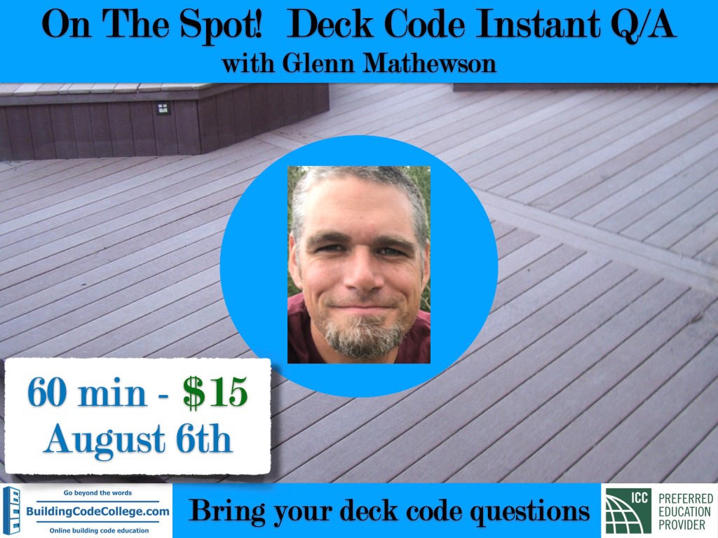 This risky webinar will put Glenn on the spot: No prepared slides, no plans, and no promises. Bring your deck code questions and get them answered immediately! Or maybe not… Remember, no promises, but all signs point to Glenn having something to say about deck code. Not sure what to ask? Just be a fly on the deck and watch, listen, and learn what others are curious about in the code. Everyone with an interest in decks is welcome. Log on early and have your question ready, as they will be answered in order until the time is up (questions will be typed in; you will not be required to share audio or video).