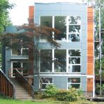 No applied window trim was used. Because the windows were completely flashed and weatherproofed at the plane of the membrane, no further flashing was needed at the level of the siding. Both the fiber- cement panels and the cedar boards (where used) stop just short of the projecting window frames, maintaining the same 1/4-inch gap used between courses.