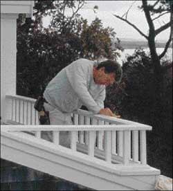 Before recoating, the author washes all trim with a combination of trisodium phosphate (TSP) and bleach to remove any salt film. This also removes surface mildew that may have collected on homes that are a few years old.