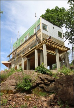 Included in the foundation work was the installation of eight piers for a stand-alone, screened-in porch (or “pavilion”) located in the middle of the home’s south elevation. The pavilion was in the initial job scope, but due to budgetary issues, it was deferred to a future Phase II. As a result, the middle portion of the wrap-around deck was left unbuilt for a year and a half while the homeowners contemplated whether to build it. In the interim, the deck section adjacent to the bedroom wing and the one at the main house were treated as two separate decks, with code-approved guardrails. [Note: The pavilion and middle deck section were completed this summer. Click here to see completed project—“A Pavilion Perched High on a Ledge”].