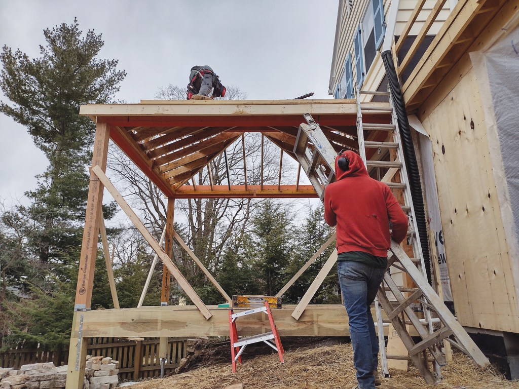 While we worked on the jack rafters, Ethan set up a station on the other side of the roof to cut the overlay rafters that form the topside gable. Despite making progress on multiple fronts, we finished the roof framing without fully assembling the overlay. However, the hip frame was fully standing in our shop.