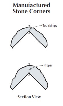 It’s possible, too, that the stone corners themselves are a minor player in this scenario. I’ve been involved in stone manufacturing, and corners are no fun to make. An outside 90-degree corner with inadequate “beef” — for lack of a better word — is much more likely to cause problems than a thicker product (see illustration). I’m not intending to criticize your stone vendor, but it might not hurt to eyeball a box of his corners and see which category they fall into.