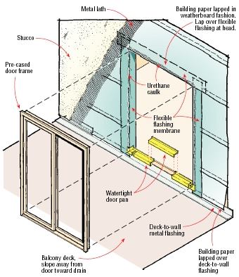 For more information, see the article “Stucco Flashing Details,” 10/98.Flashing Details for a Balcony Door