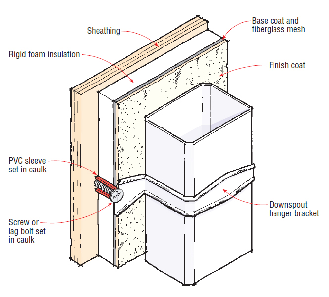 Fastening an object through EIFS will be easier if the sheathing under the foam is plywood rather than gypsum. If the sheathing is plywood, use the following procedure: 1. Mark the location of the fastener on the finish. 2. Drill a hole through the EIFS up to — not through — the sheathing. 3. Line the hole with a neutral-cure caulk. (If the caulk smells like vinegar, it should not be used. A vinegar smell indicates an acid-cure caulk, which may corrode the fastener.) 4. Cut a length of your PVC sleeve about 1/8 inch longer than the thickness of the EIFS, and insert it into the hole. The sleeve should be 1/8 inch proud of the EIFS. Tool any excess caulk. 5. Fill the sleeve with additional caulk and immediately fasten the downspout through the fresh caulk in the sleeve. Remove any excess caulk.