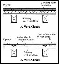 There are two ways to handle the insulation problem. The first method is to install a urethane foam insulation board and a new plywood deck over the existing sheathing (see illustration). In warm climates, a second possibility is to install a new roof deck on 2×2 sleepers over the existing sheathing, with a radiant barrier between the old and new roof decks. This would prevent the building from absorbing a significant amount of heat, providing the radiant barrier has at least a 1/2-inch air space on either side. Use either two layers of reflective foil insulation installed back to back, or one layer of a “double-polished” reflective material, which is shiny on both surfaces. The roof would then have about the same insulating value as R-11 fiberglass against downward heat flow. The space should be ventilated with continuous soffit and ridge vents. This would not be a good solution in a cold climate, where you would have to insulate against conductive heat losses from inside the building.