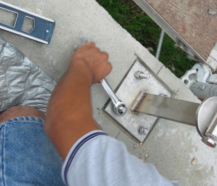 Preinstalled posts. The bases of these posts for glass railings needed to be bolted to the masonry deck.
