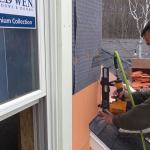 Pollard compares shingle widths to the existing shingle gap as h… Pollard compares shingle widths to the existing shingle gap as he selects pieces to fill out the course.