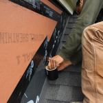 Pollard holds a shingle in place and freehand-scribes the profil… Pollard holds a shingle in place and freehand-scribes the profile of the adjacent roof edge onto the shingle.