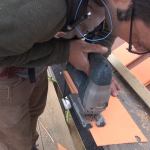 Pollard uses a jigsaw to cut a matching roof angle onto a shingl… Pollard uses a jigsaw to cut a matching roof angle onto a shingle.