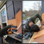 Pollard applies asphalt felt paper over the ZIP sheathing, slidi… Pollard applies asphalt felt paper over the ZIP sheathing, sliding the top edge of the paper up underneath the unstapled lower edge of a strip of paper already applied to the eave under the trim board. To his left, Pollard tucks the paper under Mortairvent rainscreen fabric already installed under the window trim.