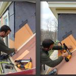 Pollard trims asphalt felt paper to fit (left) and staples it in… Pollard trims asphalt felt paper to fit (left) and staples it in place (right), using stainless steel staples and a pressure-regulator-equipped staplegun, adjusted to prevent staple crowns from punching through the paper. ZIP sheathing is rated as a weather-resistive drainage plane material, but Thompson Johnson like to add an extra layer of protection.