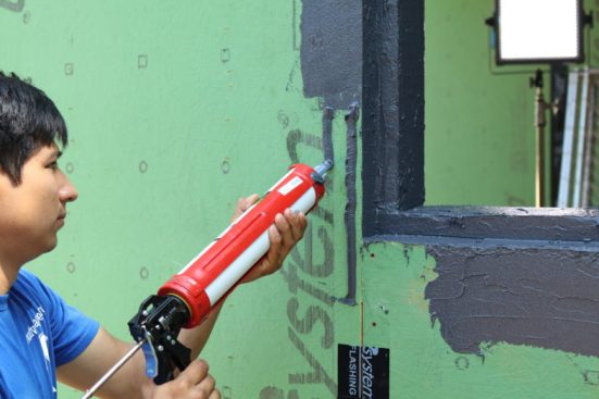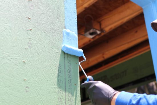 Once you’ve used the Joint Filler you’ll switch to the Blue Barrier 2400 Flash n Wrap. This is a more viscous fluid that can be used as a “housewrap” rolled onto the whole house. In this case we are using it over the Zip wall but again the advantage is that it is foolproof in the install. We coat all the way into the RO, then over the edge of the sheathing by 6” and now we have a waterproof opening.