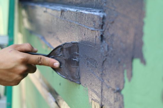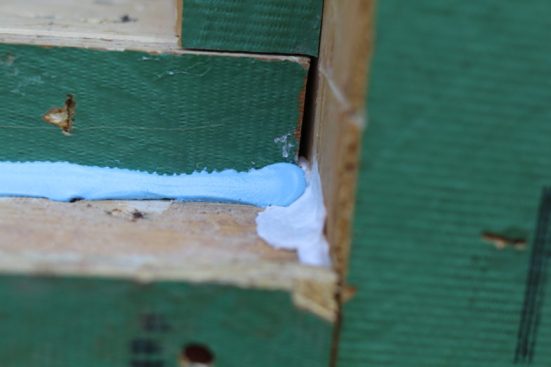 Another option for a fluid applied weather barrier that could be used on the entire house is PolyWall’s Blue Barrier system. This is a two part system and the first step is their PolyWall Blue Barrier Joint Filler 2200. This comes in 20 oz. sausage yubes (you’ll need a special caulking gun for this) and goes on first to fill and gaps/cracks and joints. If you were coating the whole house you would also use this at your sheathing joints as well using it to seal all penetrations in the envelope (hose bibs, ducts, wires, etc). This is a more dense caulking that’s fiber-reinforced and will bridge up to a 1/2-inch gap.