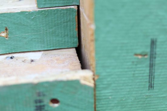 The first step in installing these correctly was to remove the windows and all the flashing that was incorrect. We want to start back at the bare rough opening. This builder was using Huber Zip sheathing that already has a weather-barrier integrated into the sheathing.