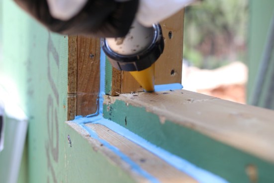 You will also use this fluid applied over the window flange on the outside, but only in the upside-down “U” shape. Don’t caulk over the nailing flange at the sill. This will give a spot for any water that leaks into the window to find a path back out.