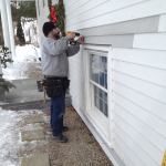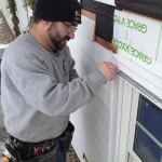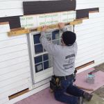To save time and money, the original siding was kept in place for the installation. To fit the exterior trim, Manny holds the molding in place and scribes a line along the ends of the siding boards.