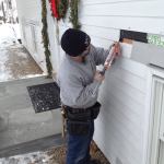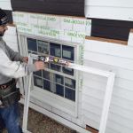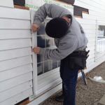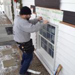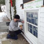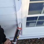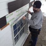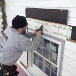 Manny applies a bead of caulk to the back side of the prefabricated window trim before setting it into place.
