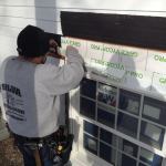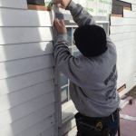Manny applies a bead of caulk to the back side of the prefabrica…