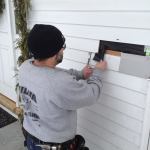 Manny pre-drills lengths of new preprimed clapboards that will be secured with stainless steel nails.