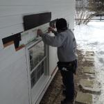 Manny installs the first of two pieces of drip cap specified by the manufacturer.